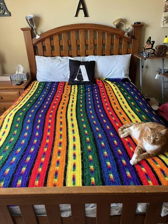 I shared this before but I wanted to show this afghan I thrifted for Pride Month Cat for scale