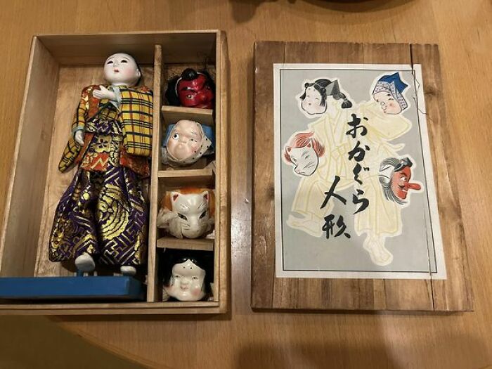 I got this cool guy at a yard sale a few weeks ago. Someone must have collected costume dolls because they had a ton, but he was in his closed box on the floor. I opened it and saw the masks and decided I needed it, since I’m a fan of Japanese folklore (and folklore in general.) He’s definitely made for tourists as a souvenir, but I think he’s pretty old