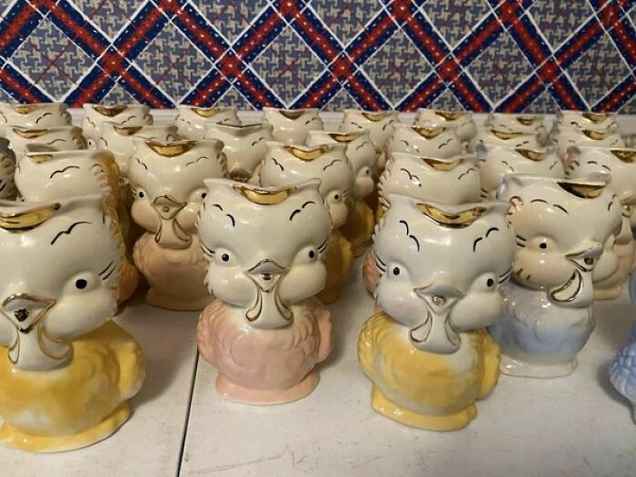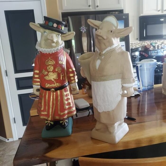 Found these ginormous porkers at an antique mall in AZ today. I have named them Charles and Camilla. The lady is marked shipman 1997. The beefeater is a butcher shop display. I’m finding them online for a total of about $500. I paid $39 plus tax for the pair. My kitchen is now “sow-ton abbey” SCORE