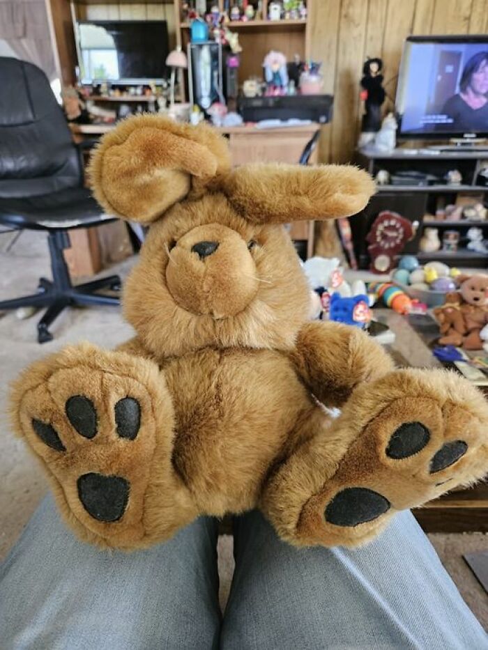 20 plus years ago I worked in an industrial laundry. Towards the end of my employment I got moved to the place that sorted laundry from area hotels and motels. We could keep whatever came through that wasn’t laundry and I became very quick at grabbing. One of my favorite things was this bunny. It doesn’t have any tags so I don’t know who made it but I love it.