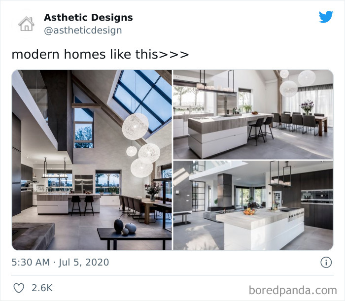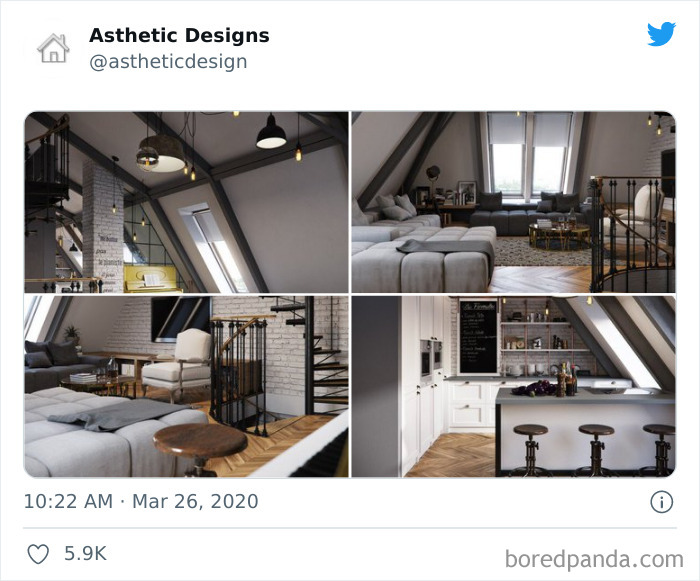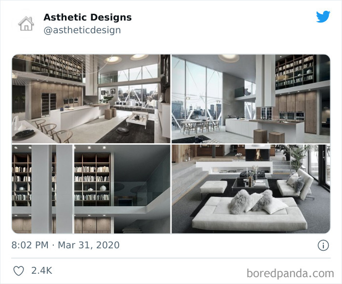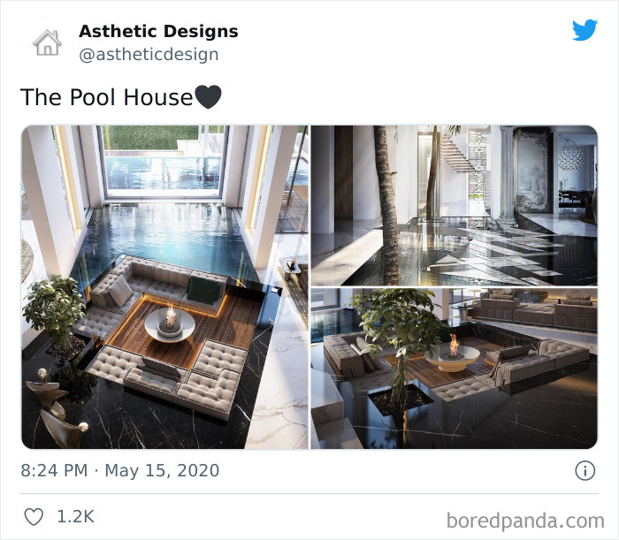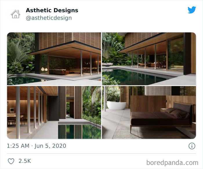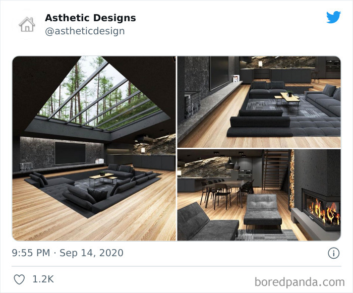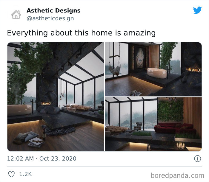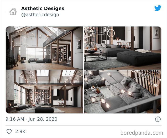 So let’s take a look at the Twitter account ‘Aesthetic Designs’, a fun little online project that collects pictures from all over the internet to show the pretty side of architecture and interior design. Whether we’re talking about concepts or real-life examples, cozy off-the-grid cabins or luxurious bedrooms, it has it all.