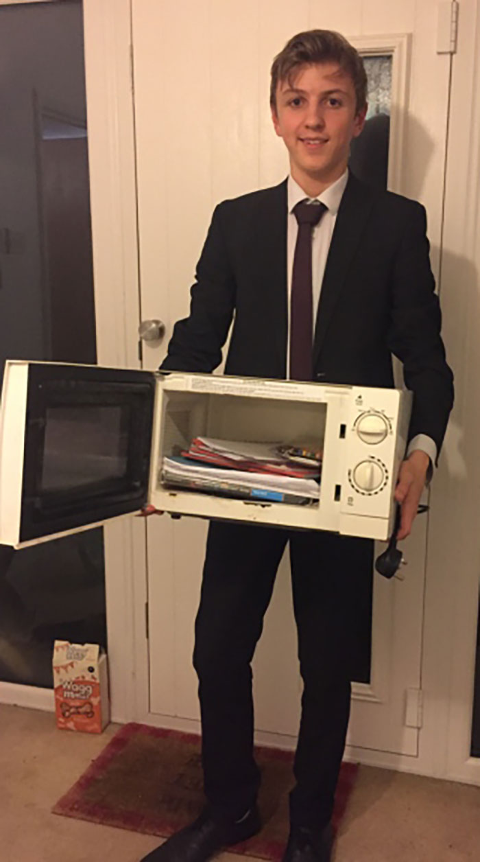 In 2018, a UK school began enforcing a policy that banned all students from carrying backpacks after two students and a staff member were injured by students carrying book bags that were slung over their shoulders. As a protest, a student carried his books to school using a microwave.