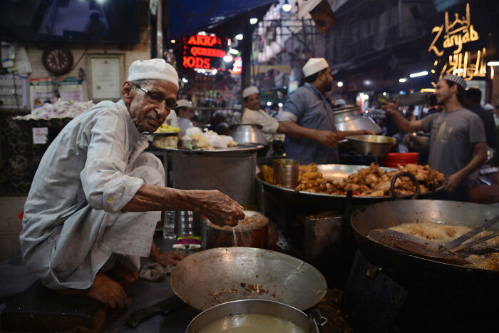 A quintessential part of Indian cities is the vibrant array of street food. During Ramadan, special dishes are prepared in huge quantities in the lanes near Delhi’s Jama Masjid. Muslims stop at their favorite restaurants to pick up meals to break their fast in the prayer yard of India’s largest mosque.