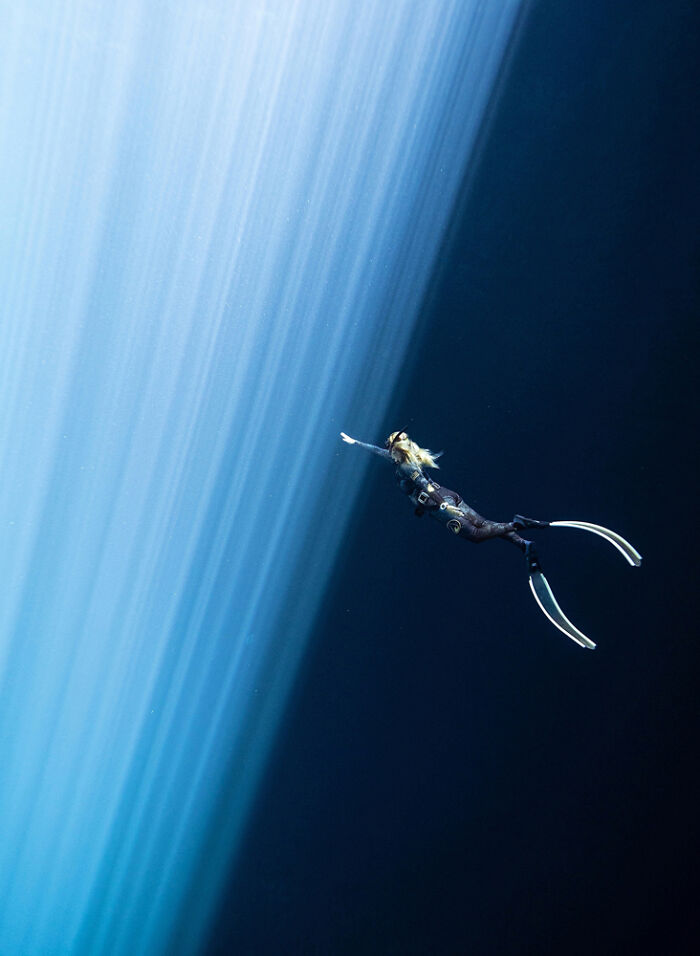 A freediver rises through the void, a shaft of light piercing the serene depths of Kilsby Sinkhole.