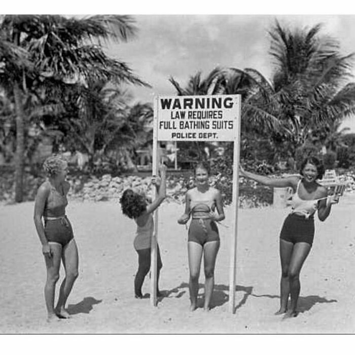 #46 Women Making Fun Of Sign At Beach Requiring Full Bathing Suits. Miami, Florida, 1934