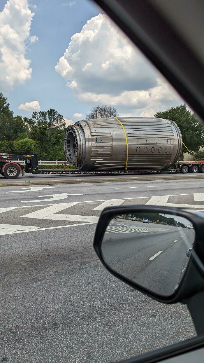 #6 Large Metal Tube With Narrowed Front End, Transported With Police Escort, On An Extended Flatbed Trailer