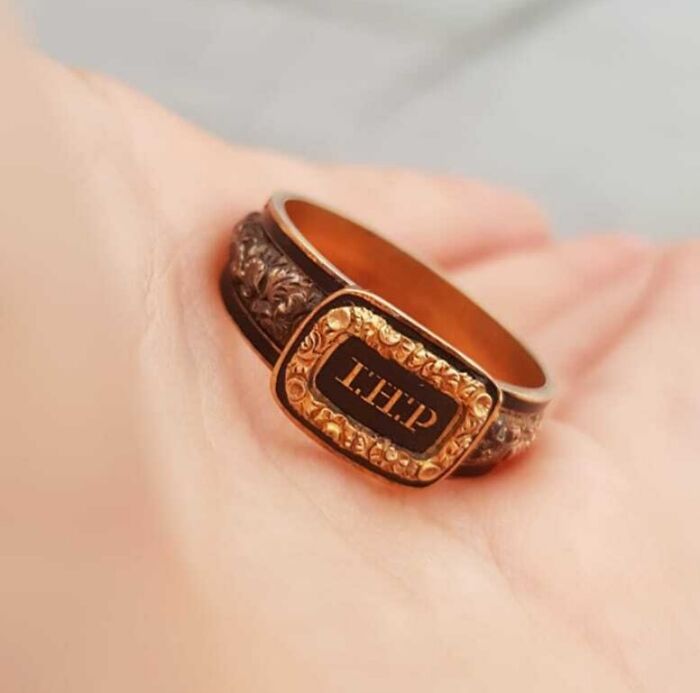 Answer: It’s a Georgian/early Victorian mourning ring. The initials belong to the lost loved one. They were typically made from gold (18k+) and enameled in black. Yours looks like it was made around 1820s-40s.