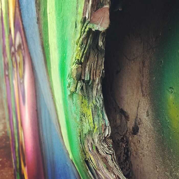 Many of the examples here focus on paint, from graffiti to interior design. While each layer might seem tiny, just a millimeter thick, these pictures show just how quickly they add up. Jerry Seinfeld had a bit describing how repainting his apartment always made him nervous, as he could feel it “closing in” around him.