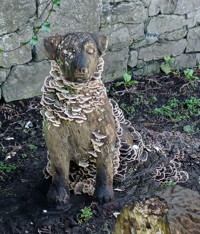 #31 Wooden Dog Sculpture In The Local Park Got A Little Mycology Make-Over