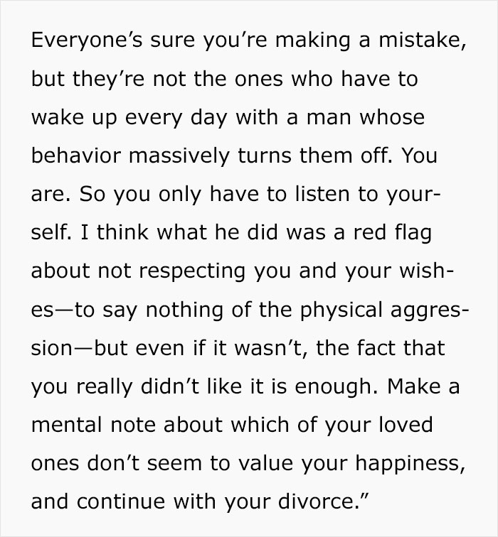 She asked for a divorce the very next day, but everyone around her said she was overreacting and should give her man another chance. But she doesn’t want to and believes in her judgment. So the woman described what happened and asked for reassurance if what she was doing was OK.